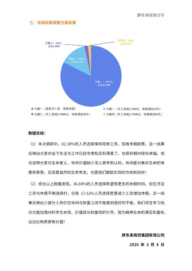 核心政策调整投票环节中,公司提供四种方案:方案一(保留现有月工资与休假)、方案二(月工资减500元,休假增10天)、方案三(月工资减1000元,休假增20天)、方案四(月工资减1500元,休假增30天)。结果显示,82.38%的员工(7979人)选择方案一,仅17.62%的员工愿意通过降薪(最多减1500元)换取更多休假(最多增30天)。