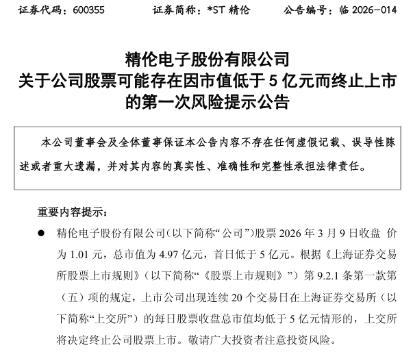 3月9日晚间,*ST精伦发布公告称,公司股票当日收盘价为1.01元/股,对应总市值仅4.97亿元,首次低于5亿元红线。根据《上海证券交易所股票上市规则》,若公司股票连续20个交易日收盘总市值均低于5亿元,上交所将启动终止上市程序,且此类交易类强制退市股票不进入退市整理期。