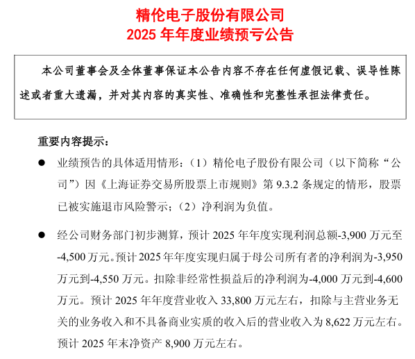 除市值问题外,公司2025年度业绩预告显示净利润为负,且扣除无关业务收入后的营收低于3亿元,年报披露后将触及另一项退市条款,进一步加剧了退市风险。