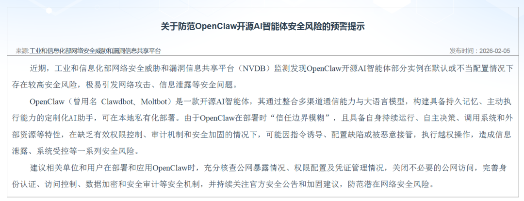 近日,工业和信息化部网络安全威胁和漏洞信息共享平台发布《关于防范OpenClaw开源AI智能体安全风险的预警提示》,指出监测发现OpenClaw开源AI智能体部分实例在默认或不当配置下存在较高安全风险,极易引发网络攻击、信息泄露等安全问题。