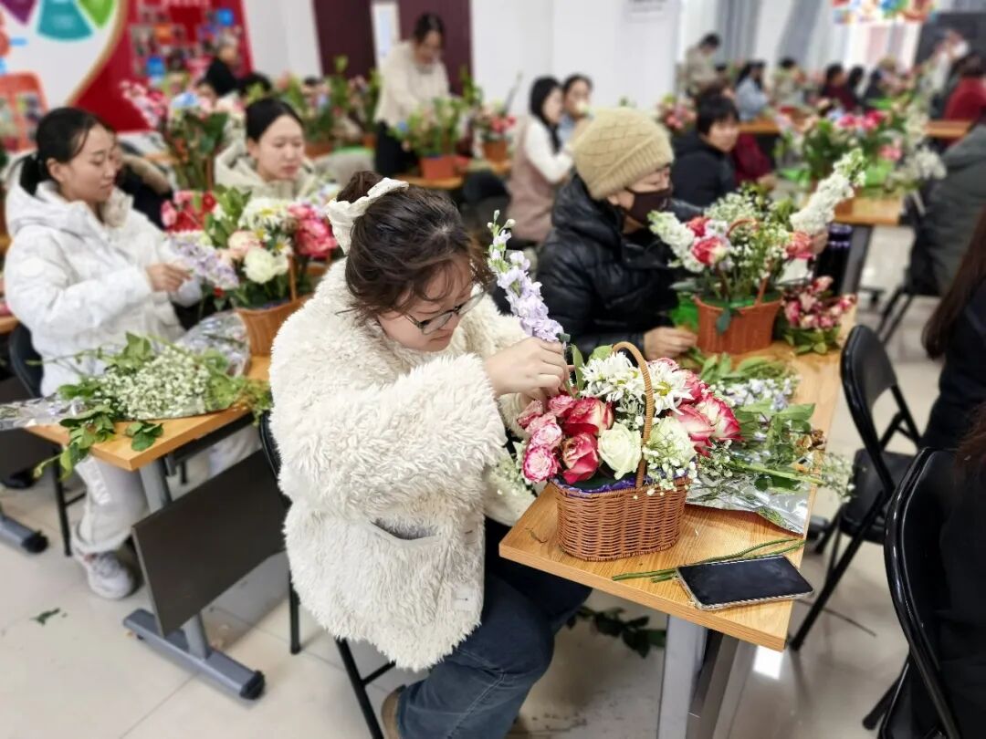 宝日呼吉尔街道北站社区的插花活动现场香气袭人。专业花艺老师细致讲解了花枝修剪和色彩搭配的技巧,居民们纷纷动手创作,用巧手打造出精美的花艺作品。居民王女士手捧自己的作品笑着说:“亲手插花不仅能放松心情,还认识了不少新朋友,这个节日过得特别有意义。”