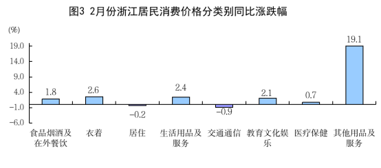 其他七大类价格同比五涨二降。其中,其他用品及服务、衣着、生活用品及服务、教育文化娱乐和医疗保健类价格分别上涨19.1%、2.6%、2.4%、2.1%和0.7%;居住、交通通信价格分别下降0.2%、0.9%。