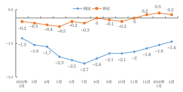 国家统计局浙江调查总队的数据显示:2026年2月,浙江工业生产者出厂价格(PPI)同比下降1.4%,降幅较上月收窄0.2个百分点;环比上涨0.2%,涨幅较上月收窄0.1个百分点。工业生产者购进价格(IPI)同比下降1.3%,降幅较上月收窄0.2个百分点;环比上涨0.3%,涨幅较上月收窄0.6个百分点。1—2月平均,浙江工业生产者出厂价格较上年同期下降1.5%,工业生产者购进价格下降1.4%。