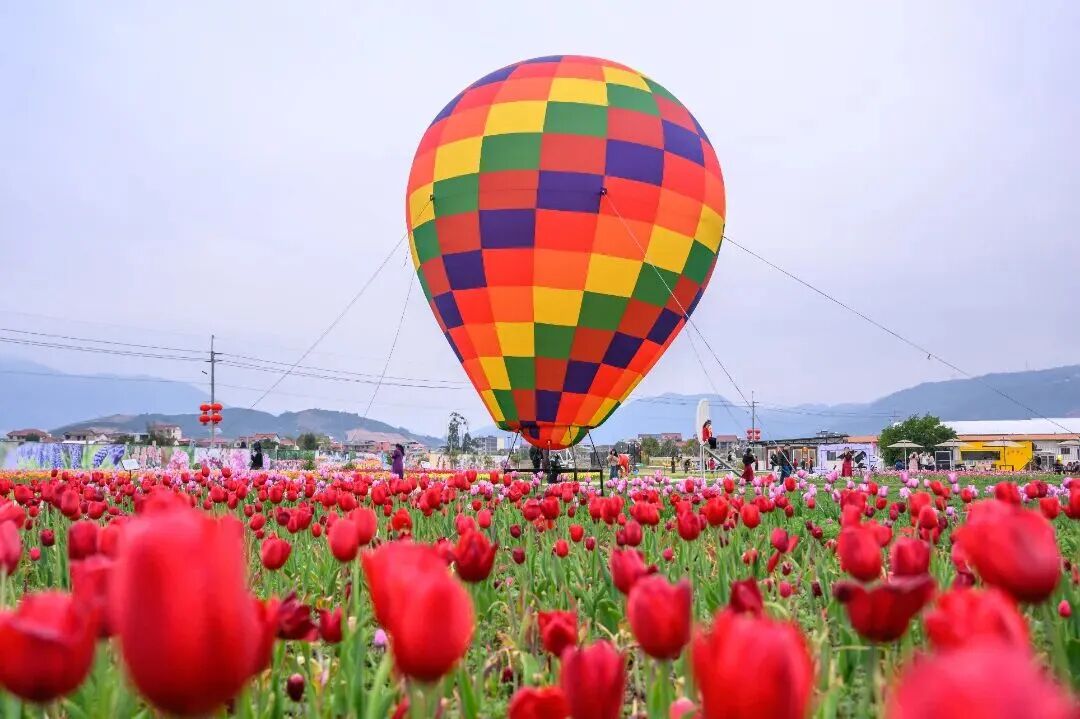 仙游县度尾镇木兰溪畔农文旅融合示范基地,郁金香以绚烂花海迎游客,金黄、火红、粉白等色彩处处是惊喜