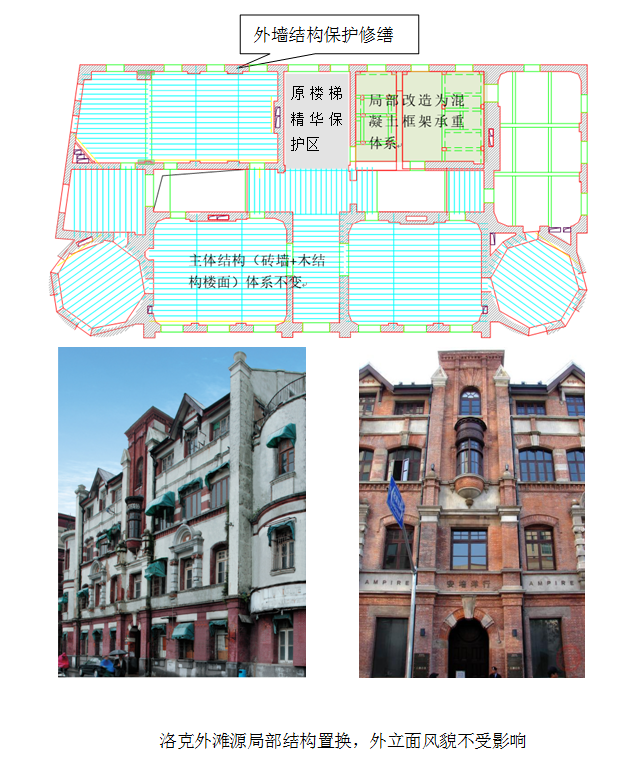 洛克外滩源的安培洋行是上海三类优秀历史建筑,属砖木结构。按分级保护要求,其外立面、楼梯及部分天花吊顶为重点保护部位,需严格保留原貌。结合功能更新需求,部分楼面需改造为电梯间和卫生间。改造遵循“局部改造、不破坏核心风貌”原则,仅拆除该部位的木结构楼面,局部置换为钢筋混凝土框架结构,主体结构体系保持不变,确保外立面风貌不受影响。