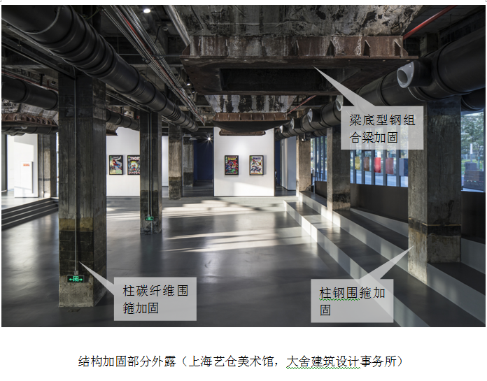 上图为上海艺仓美术馆的使用场景照片。从中可见,大量加固痕迹未被覆盖,直接外露,体现了建筑师的独特风格与创作自信。