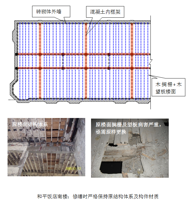 和平饭店南楼是国家级文物建筑,也是上海市优秀历史建筑,修缮工作严格遵循“修旧如旧”原则,对破损严重的构件进行更换,确保建筑立面、结构体系、平面布局及重点保护装饰均保持原貌。针对原木搁栅的腐朽、虫蛀问题,更换时仍采用原材质——美国花旗松(Douglas Fir)。