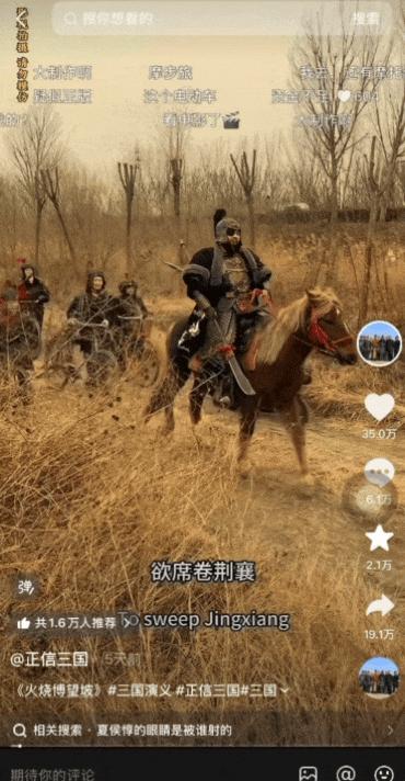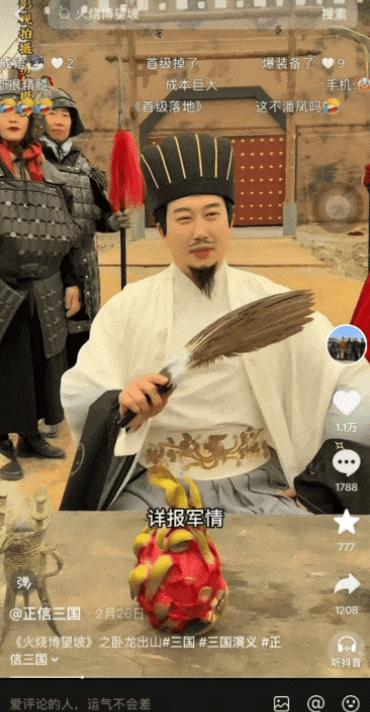 @正信三国是由普通农民自发组建的短视频账号,他们用最朴素的方式还原《三国演义》经典桥段。靠着手工缝制的戏服、东拼西凑的道具,积累了大批忠实观众,甚至单条视频的点赞量比账号总粉丝数还多!