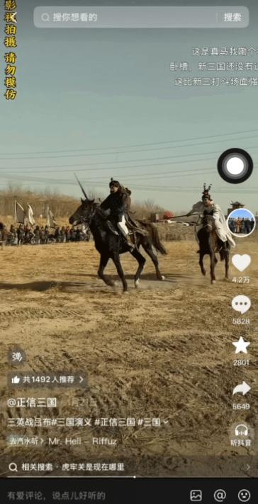 这并非某个专业剧组的外景拍摄,而是抖音账号@正信三国的日常更新。没有绿幕,没有特效,拍摄设备是手机,“战场”选在荒山田地,“步兵”则是推着自行车的男女老少。