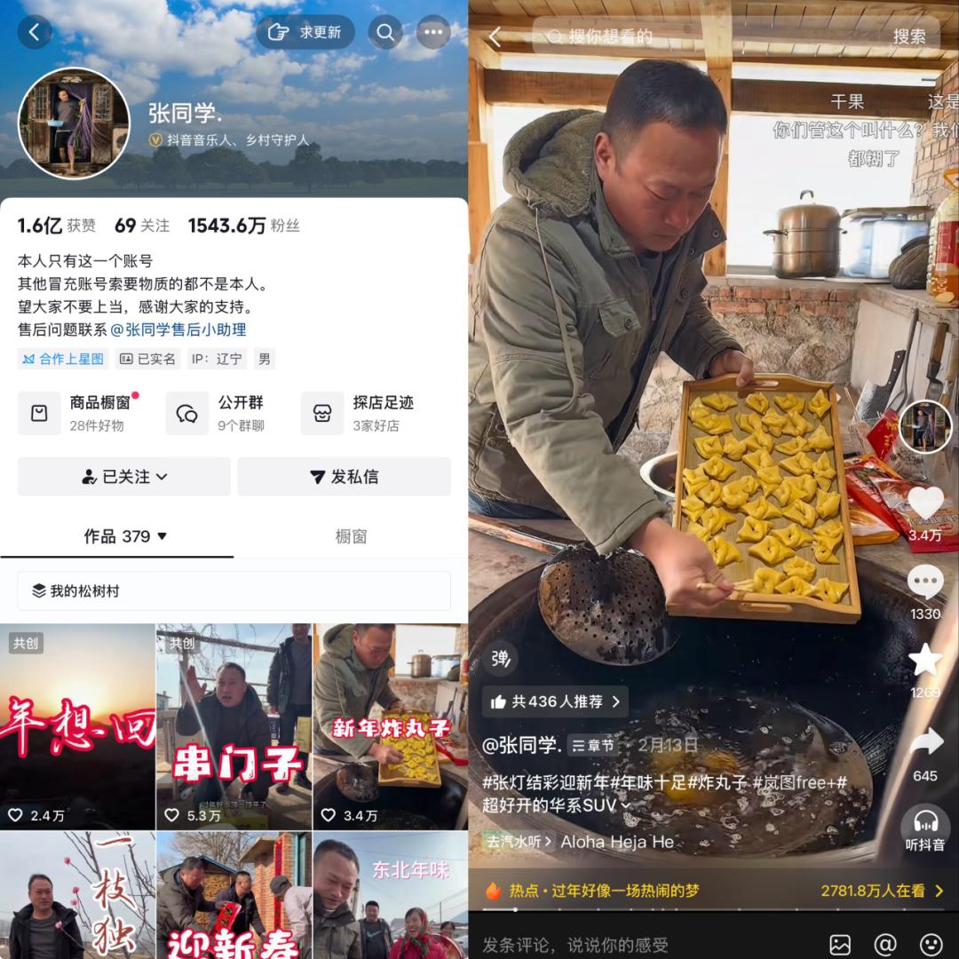还记得60天涨粉1400万、打破纪录的@张同学吗?他的视频看似是随意的流水账,记录起床、喂鸡、做饭等日常,却打破了以往乡村视频中田园牧歌的滤镜,展现了东北农村冬天真实的“糙”与“暖”。