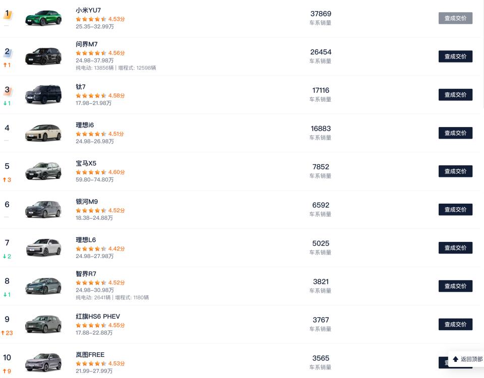 有趣的是,大型SUV销量前列多是混动车型,但蔚来ES8凭借换电设计和超8600座换电站,连续两月夺得销量冠军,补能体验不输混动,也是YU9的劲敌。