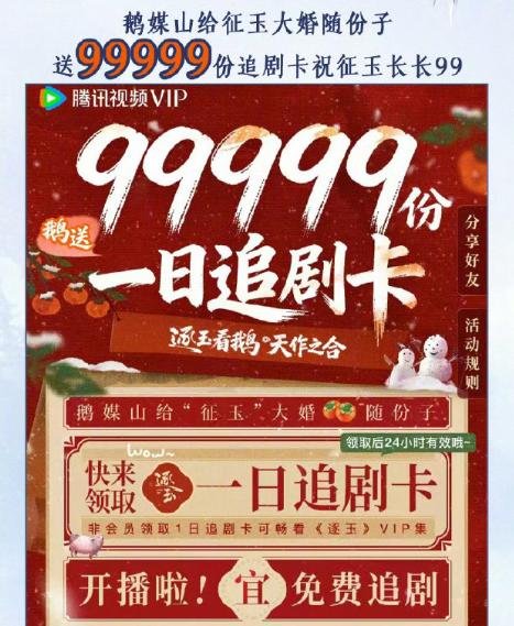 如果说这些只是宣发倾斜,那腾讯视频送出99999份一日专属追剧卡,就是真金白银“助推”了,这在长剧市场引发不小争议。
