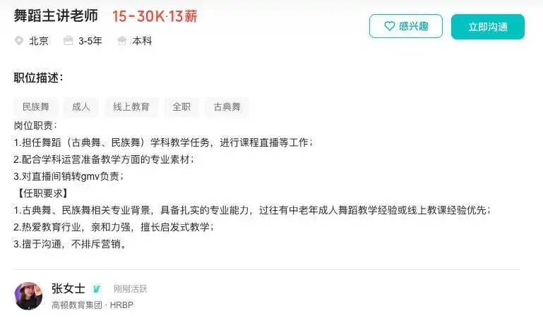 目前,高顿正在招聘舞蹈主讲老师等岗位,岗位描述中明确要求“承担舞蹈学科的教学任务,完成课程直播等工作”,并且特别指出“有中老年成人舞蹈教学经验或线上授课经验者优先考虑”。