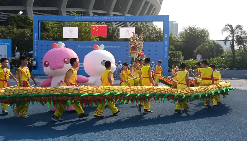 ——篁湾小学少儿纱龙队走进全国残特奥会江门赛区足球赛场进行展示,以青春的龙姿为运动健儿助威,传递积极向上的力量。