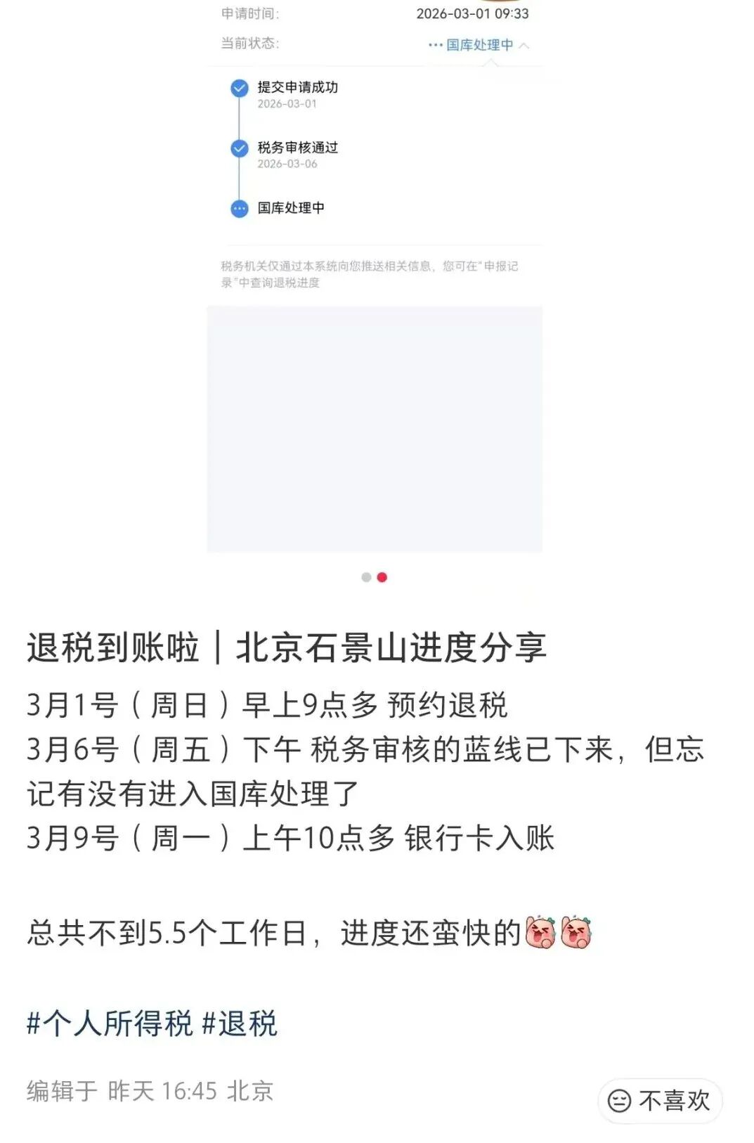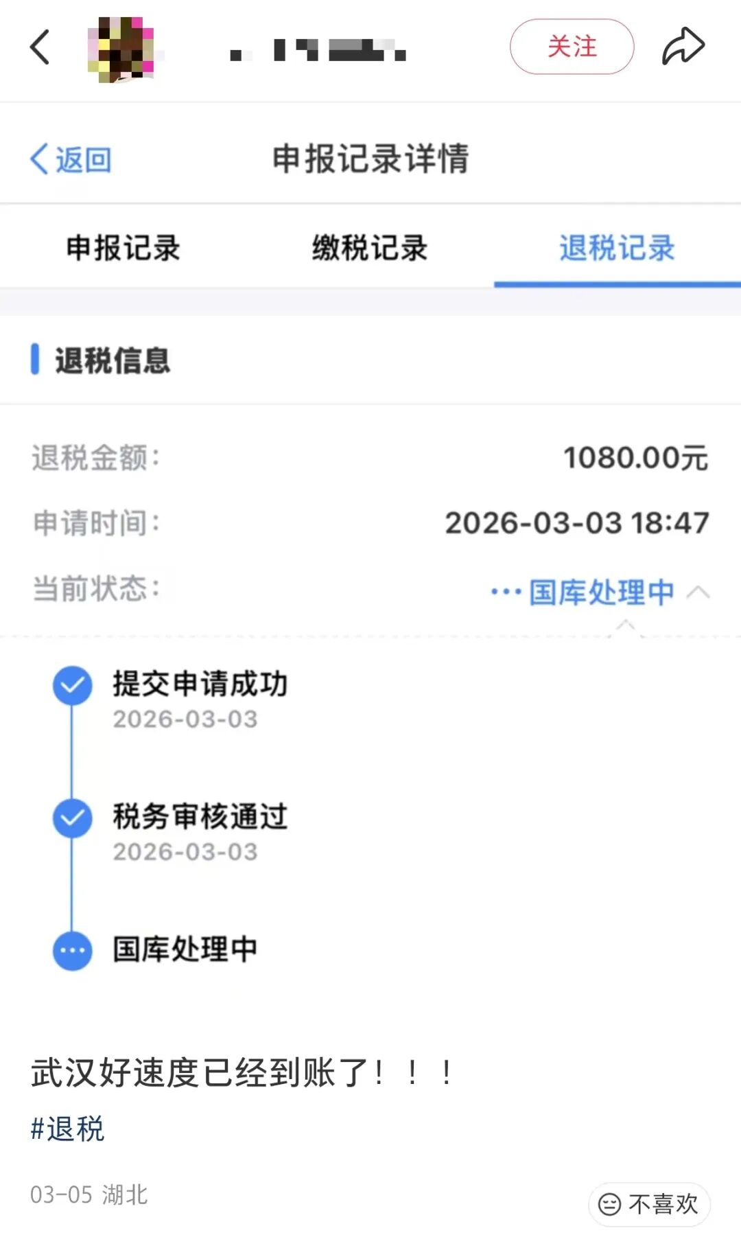 在社交平台上,不少网友分享了自己的退税经历,还有人晒出了退税金额,从几百元到几万元不等,有网友开心表示“三月的第一份快乐来自退税”。