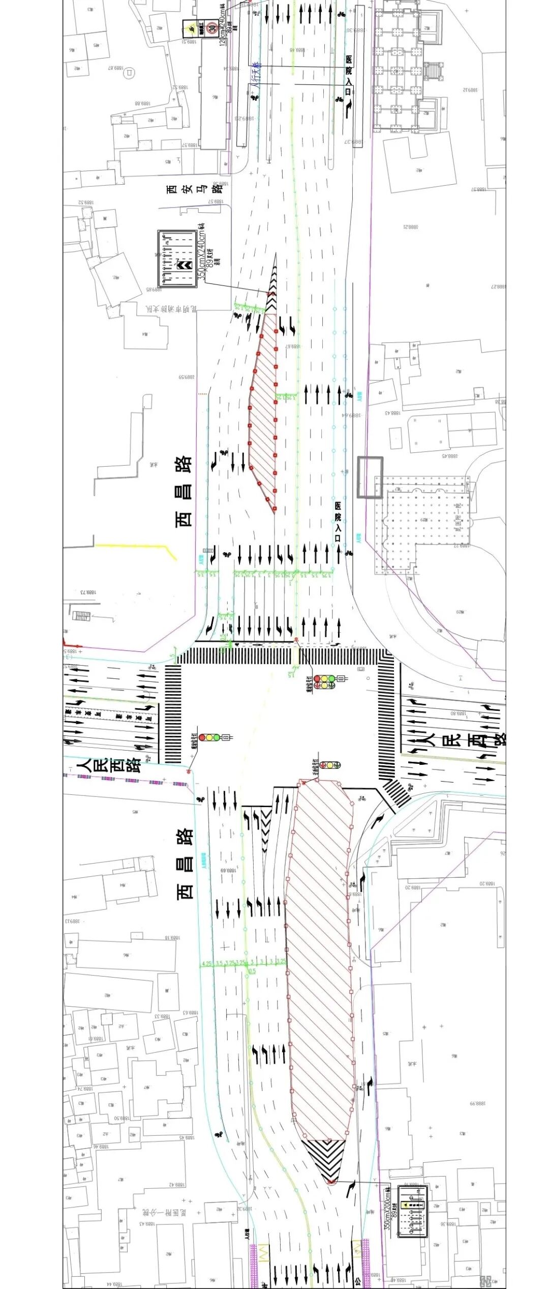 其二,占用西昌路与人民西路交叉口北口西侧长约120米、宽约18米的路面进行施工。施工期间,西昌路北口车道整体向东偏移,保障双向8条机动车道和2条非机动车道的通行空间,其中西昌路右转车道位于围挡西侧。此段围挡施工工期为3月13日至10月31日。