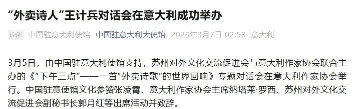意大利当地时间3月7日,中国驻意大利使馆官方公众号发布题为《“外卖诗人”王计兵对话会在意大利成功举办》的文章,指出“外卖诗人”王计兵与意大利读者面对面,以诗为媒,讲述普通人的梦想与坚持,续写中意文化交流的动人篇章,为即将落幕的2026马年“欢乐春节”活动增添了诗的真挚与温情。