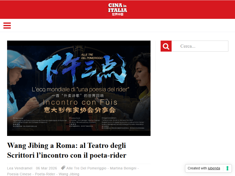 意大利当地时间3月6日,《世界中国》杂志社以《王计兵在罗马:在意大利作家协会小剧场的观众与“外卖诗人”的聚会》为题,对活动进行报道。报道强调,此次分享会的特别之处在于王计兵和林明月(Martina)两位“主角”的出席,他们凭借彼此的相遇、对文学的热爱以及《下午三点》这首诗,成功搭建起了中意之间的文化桥梁。