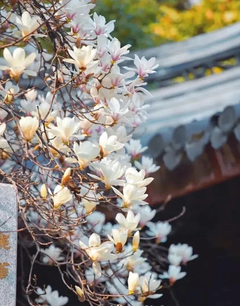 江南名刹龙华寺藏着沪上最具禅意的白玉兰景观。三圣殿旁,一株相传为清乾隆年间方丈手植的白玉兰,历经三百余年风雨,如今正悄然绽放,虬枝苍劲,满树繁花,与寺庙的青瓦黄墙、飞檐斗拱相映成趣,自带静谧悠远的意境。