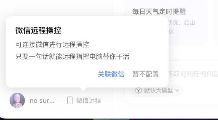登录后,用户可选择是否用微信远程操控龙虾。选择关联微信后,QClaw会生成一个二维码,用微信扫描即可,操作便捷,无需像飞书那样配置id和密钥。