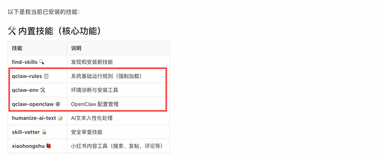 另外,QClaw的内置技能也有亮点,这些是原版OpenClaw完全没有的。