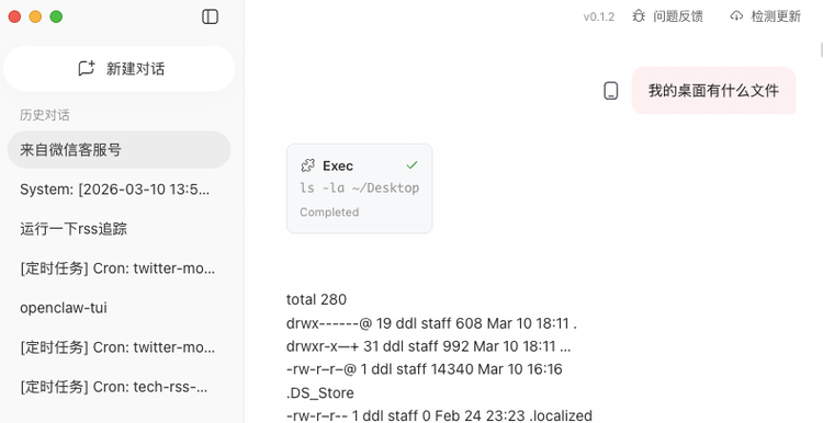 关联后,QClaw会将用户与龙虾的对话记录同步到左侧栏。比如测试时,飞书和TUI上与龙虾的对话流就直接显示出来了。