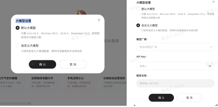 用QClaw新装龙虾时,首页会让用户选择模型。默认会从Kimi K2.5、Minimax M2.5、DeepSeek V3.2中随机分配一个,用户也可以通过API接入自己的模型。