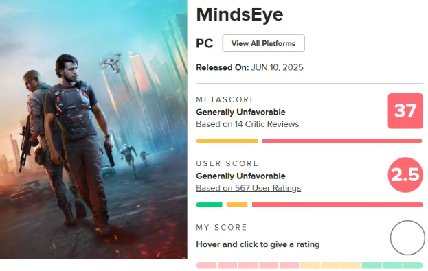 去年年底,评分网站Metacritic发布了2025年“最差游戏榜”,前GTA制作人Leslie Benzies牵头开发的《心之眼》(Mindeyes)以37分的媒体评分垫底,成为年度最差游戏。