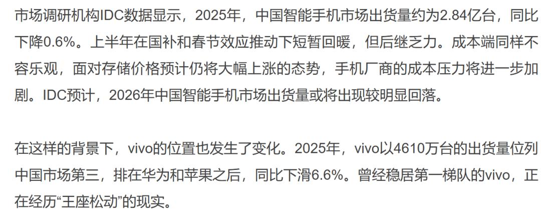 市场调研机构IDC数据显示,2025年中国智能手机市场整体出货量约为2.84亿台,同比微降0.6%,市场增长乏力。在此背景下,vivo的市场地位发生显著变化:2025年其在中国市场的出货量下滑至4610万台,同比下跌6.6%,市场份额从榜首滑落至第三,位列华为和苹果之后,曾经稳固的“王座”已松动。