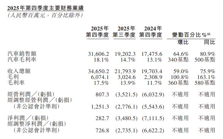 更关键的是盈利能力跃升:四季度汽车毛利率达18.1%,同比提升5个百分点,单季毛利60.74亿元,同比暴涨163.1%,足以覆盖费用支出并实现盈利。