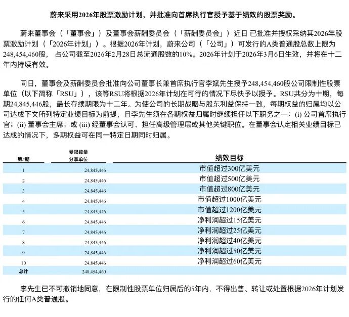 解锁条件分两大赛道:市值赛道设5档,要求蔚来美股市值依次突破300亿、500亿、800亿、1000亿、1200亿美元,每达标一档解锁1/10股份;盈利赛道同样5档,需公司年净利润依次跨越15亿、25亿、40亿、50亿、60亿美元,每完成一个目标解锁对应份额。
