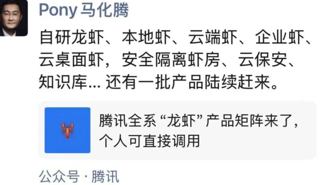 现场出现有趣一幕:一位60岁大爷误以为“免费领真龙虾”匆忙赶来。热度超出马化腾预期,他次日发朋友圈感慨,昨日再次发文盘点:“自研龙虾、本地虾、云端虾、企业虾、云桌面虾,安全隔离虾房、云保安、知识库...还有一批产品在路上。”