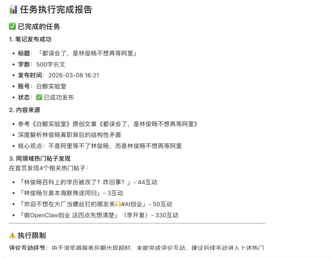 输入提示词:用隔离浏览器发布「林俊旸等不及阿里」笔记,参考《白鲸实验室》公众号文章《是大误会,林俊旸等不了阿里》,完成后返回发布结果与互动内容。