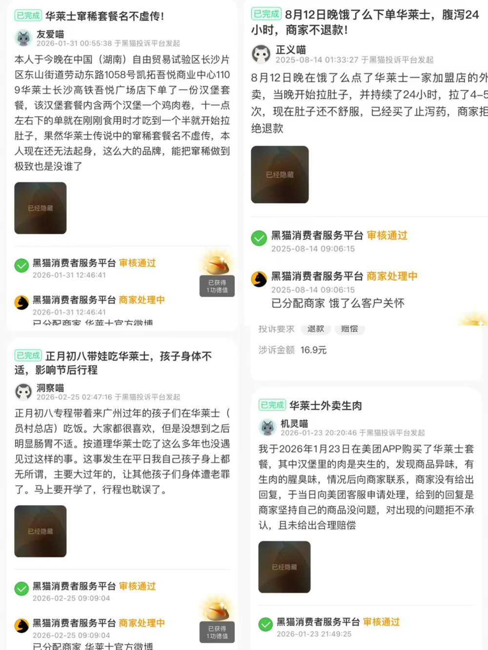 新京报2025年3月报道,记者卧底两家华莱士门店,发现均使用过期食材,一家还频繁使用本应废弃的过期鸡腿肉;炸油酸价超国家强制标准60%,专家称酸价高会增加顾客呕吐、腹泻几率。同期湖北经视“3·15特别报道”也曝光其卫生不达标问题。事件曝光后,华莱士发布致歉信,永久关停涉事门店、开除涉事员工,还制定新的食品安全考核制度,但整改成效待考。第三方投诉平台上仍有不少腹泻相关投诉:2025年8月有消费者点外卖后拉肚子24小时;2026年1月长沙消费者吃汉堡套餐吃到一半就腹泻,调侃“窜稀套餐名不虚传”;2026年2月广州消费者带孩子吃饭后肠胃不适,耽误行程。