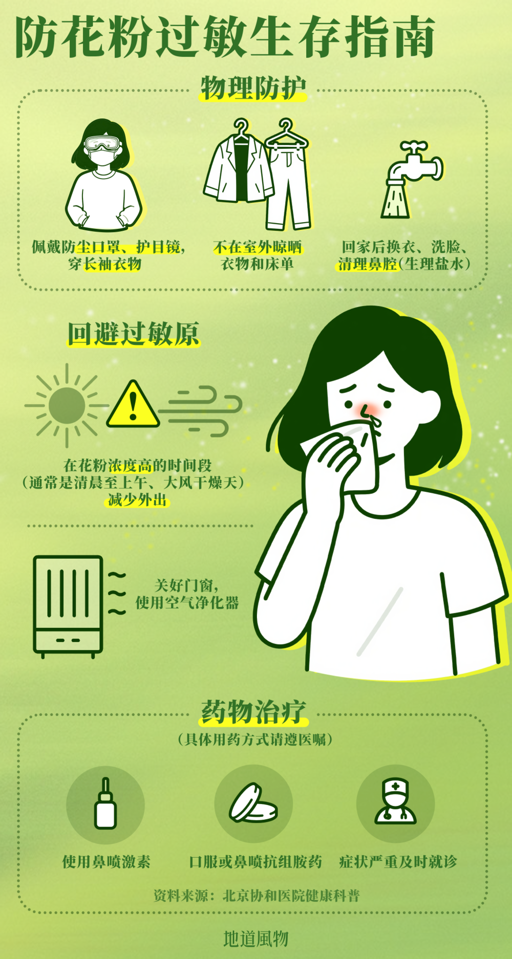 过敏者常因鼻塞憋醒,硬扛不可取。应预防性用药,提前咨询医生或用生理盐水洗鼻;做好物理防护:戴KN95口罩和护目镜,回家后洗头换衣,开启空气净化器。