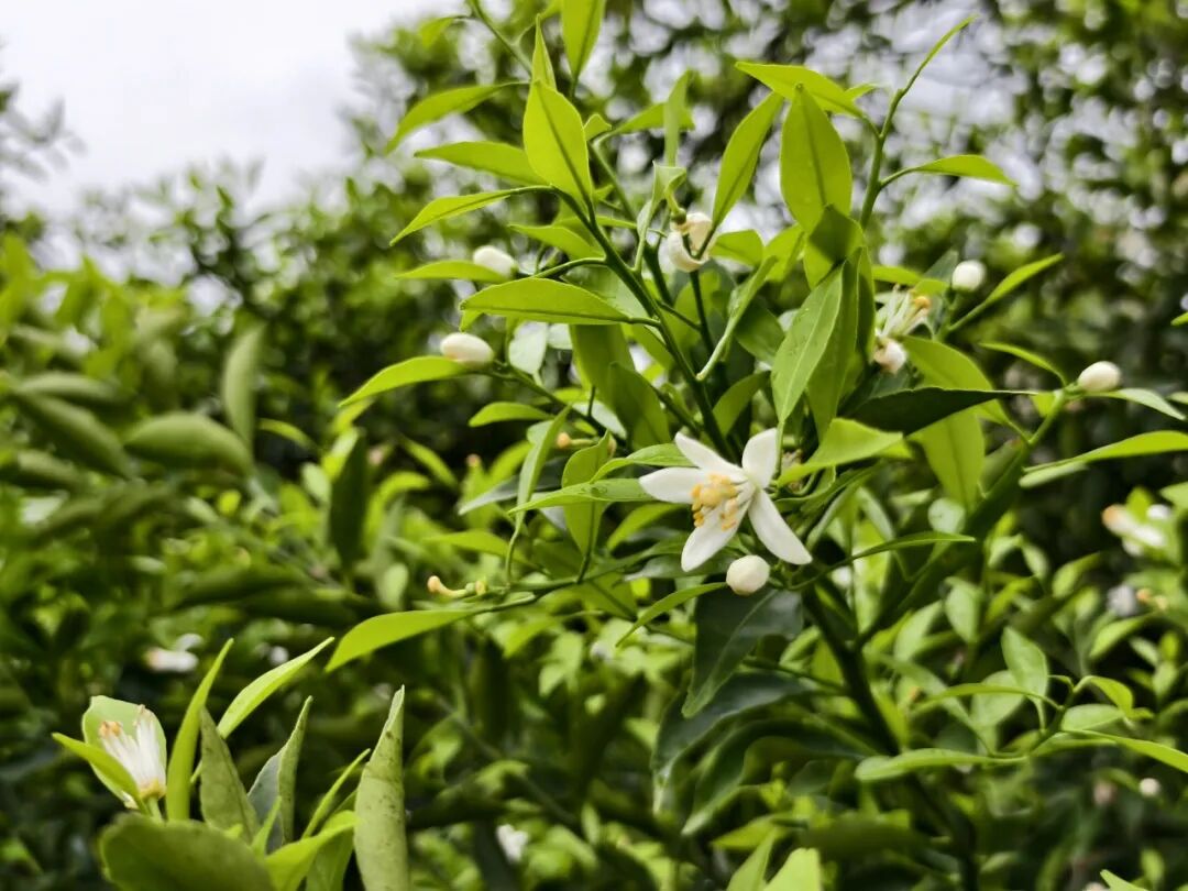 春耕之际,新会的特色产业新会柑也进入花期。枝头的柑花洁白素雅,香气四溢。柑农们抓住时机,在柑园里进行剪枝、施肥等管护工作,为今年柑果丰收做准备。