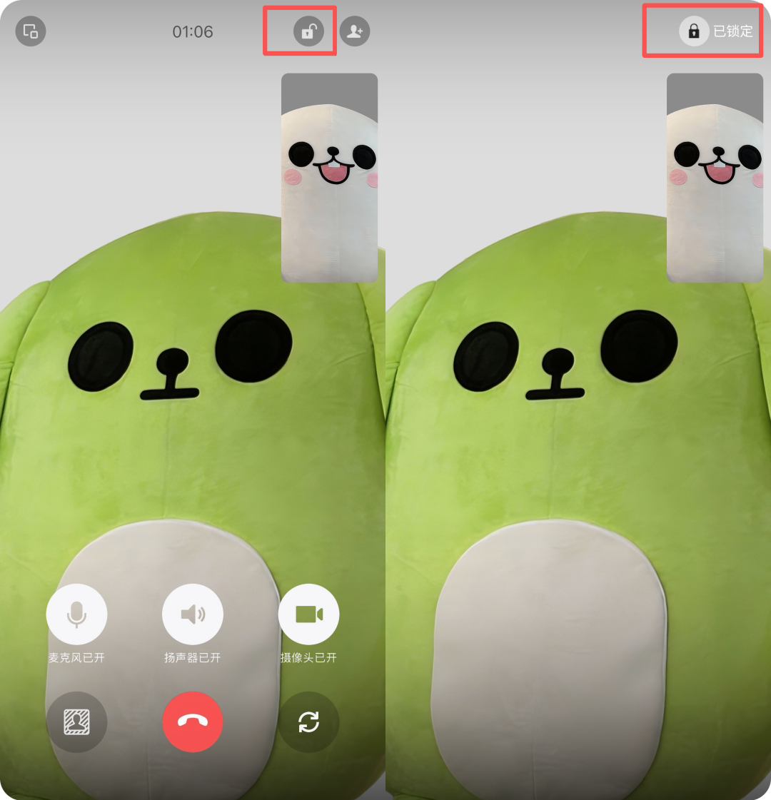 第三项功能是视频通话屏幕锁定。不少小伙伴在视频通话时会不小心误触挂断按钮,现在只需在视频通话时点击右上角的?图标,就能锁定屏幕,避免误操作,让视频聊天更安心。该功能同样在逐步放量中。