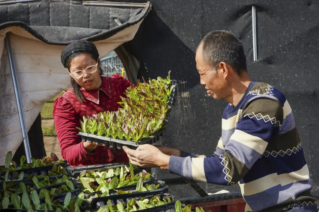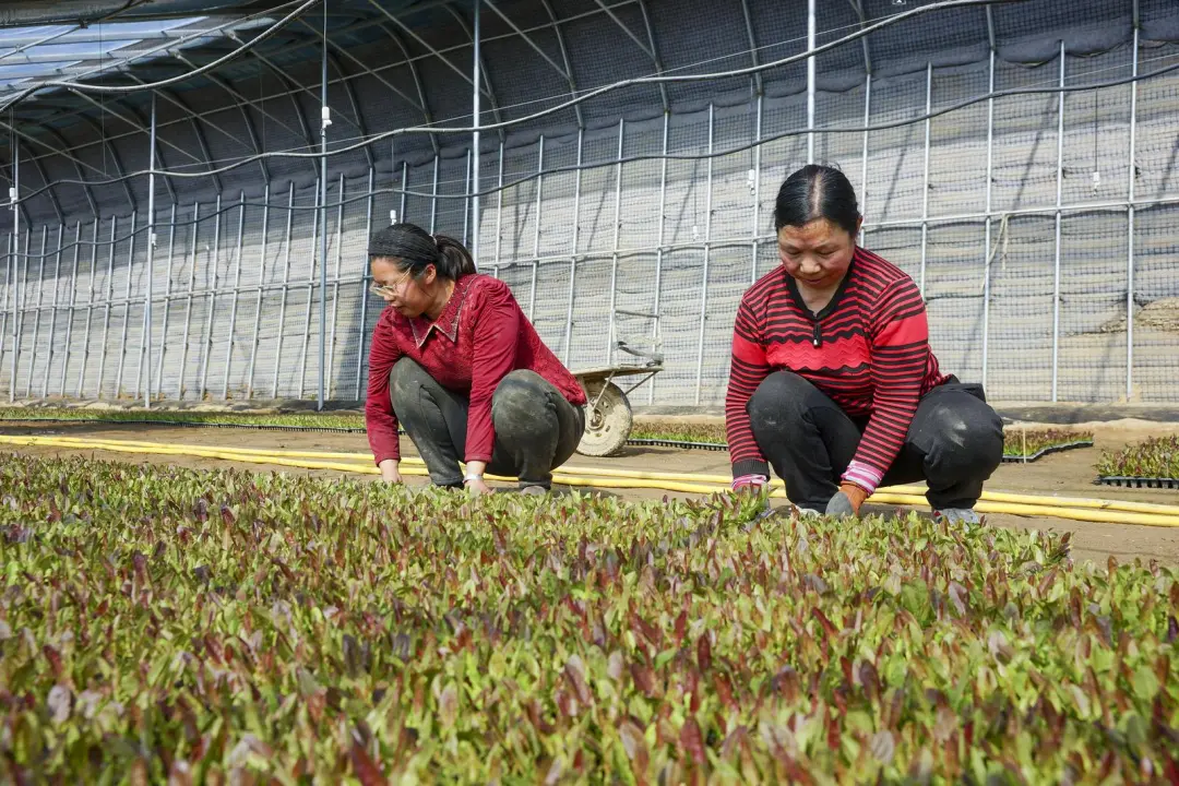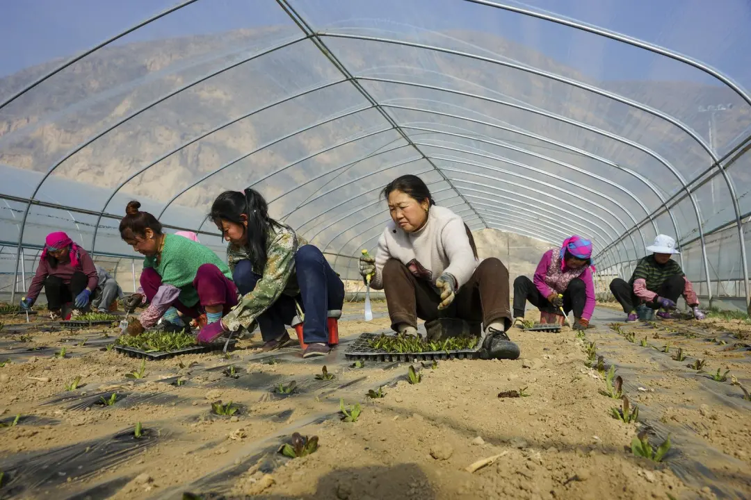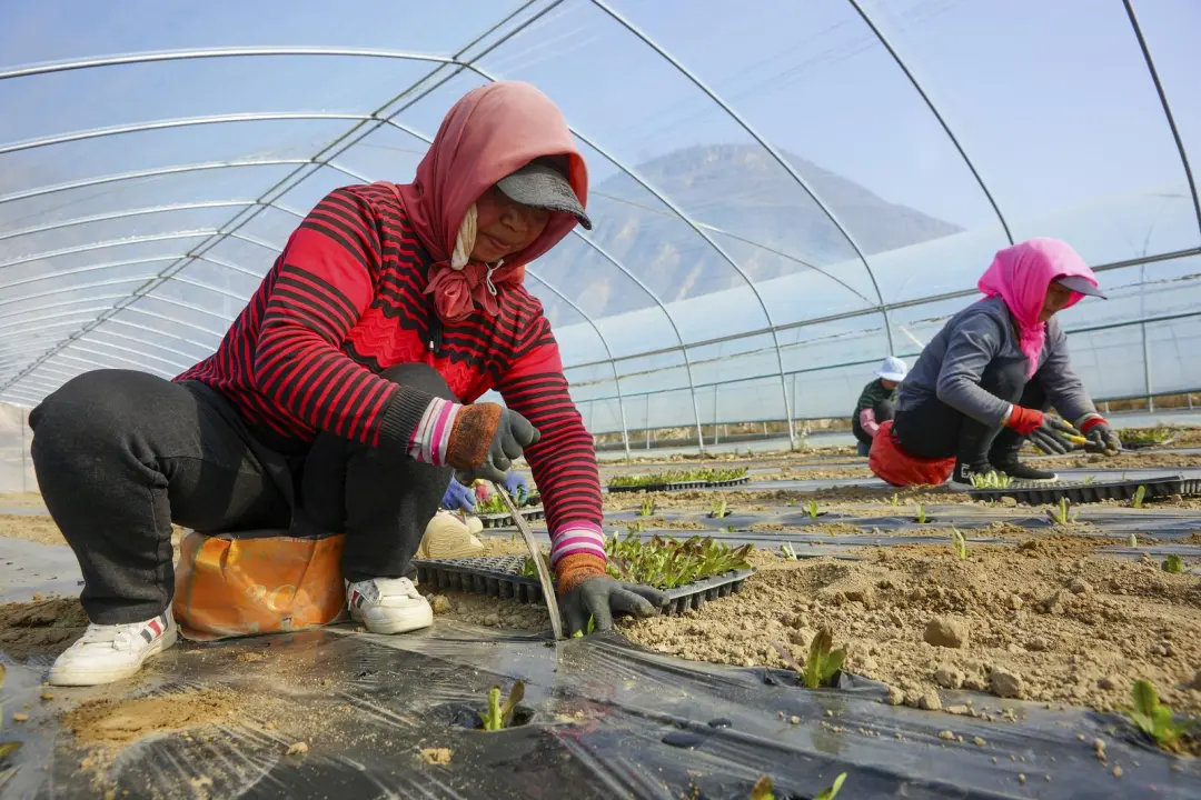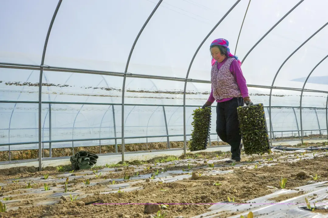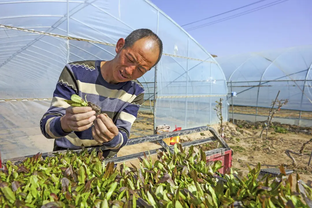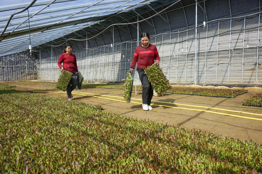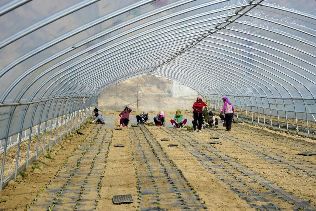 牛谷河畔春意渐浓,通渭县襄南镇黑石头村的蔬菜种植基地里,一排排大棚在春日暖阳下熠熠生辉。日光温室中,脆嫩鲜绿的红笋幼苗生机盎然,农民们正忙着搬运、分送、定植、浇水,用双手编织着丰收的希望。
