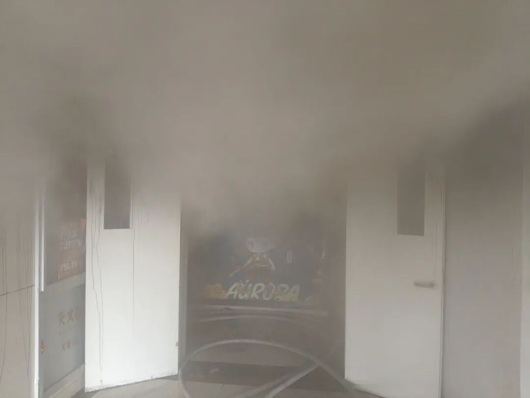 可一打开房门,眼前的景象让他瞬间紧张:楼道的灯已熄灭,整个走廊浓烟滚滚。他立刻退回房间。