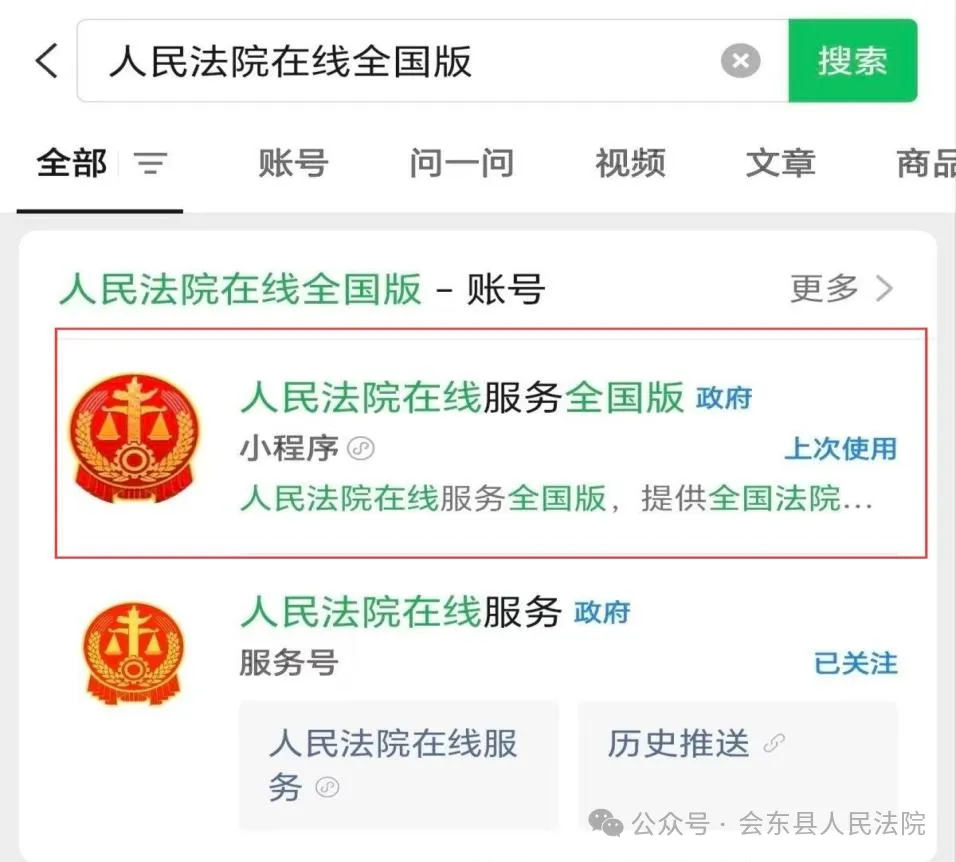 打开微信,在小程序搜索栏输入“人民法院在线服务全国版”,点击进入对应的服务页面。