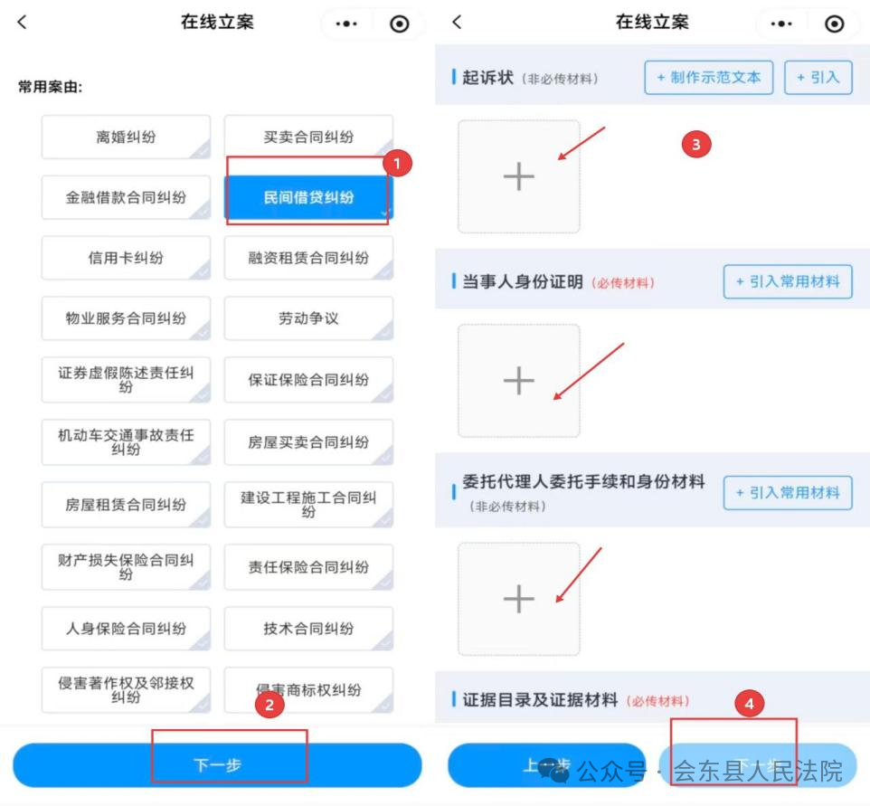 根据案件类型选择对应案由,上传所需材料(带*标识为必填项),材料上传完毕后点击“下一步”。