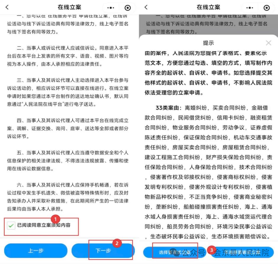 勾选“已阅读并同意立案须知内容”,点击“下一步”后选择“要素式立案”模式。