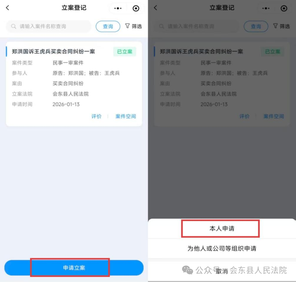 点击“申请立案”,根据实际情况选择“本人申请”或“为他人/公司等组织申请”。