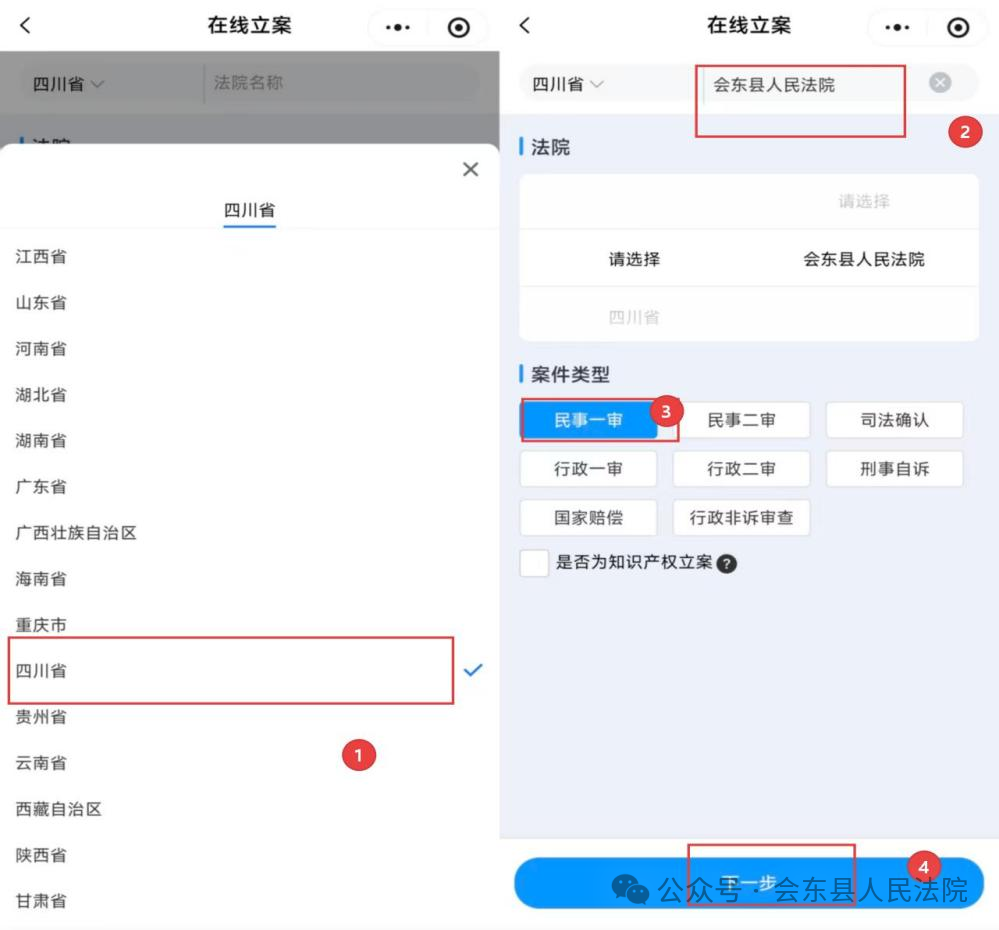 地区选择“四川省”,搜索并选定“会东县人民法院”,案件类型选择“民事一审”,然后点击“下一步”。