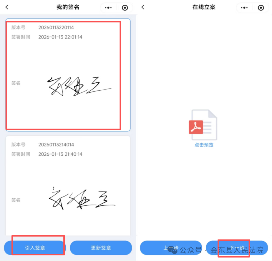 点击签名区域,选择“引入签章”功能完成电子签名,随后点击“下一步”提交申请。