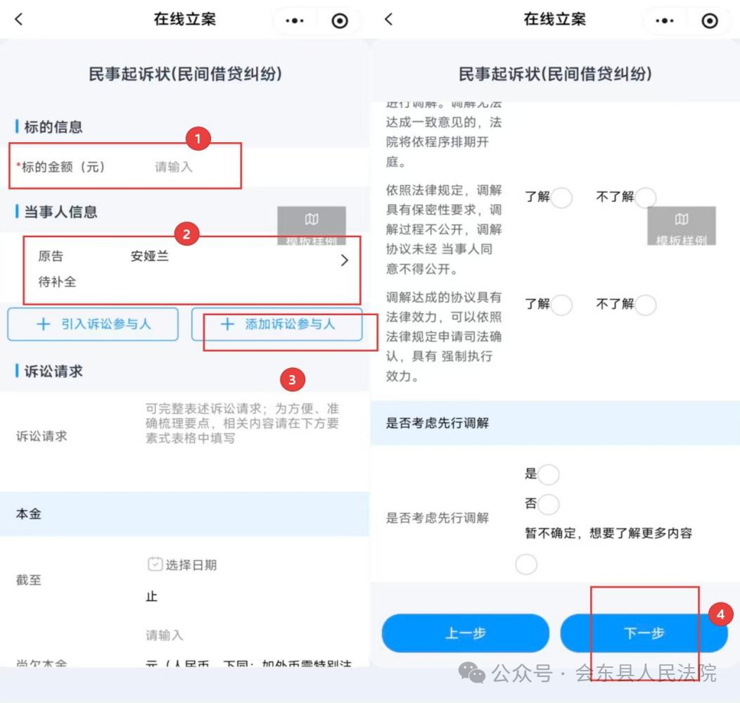 填写诉讼标的信息(若无标的金额则填0),点击“添加诉讼参与人”,录入原被告及代理人信息(无代理人可跳过),完成后点击“下一步”。