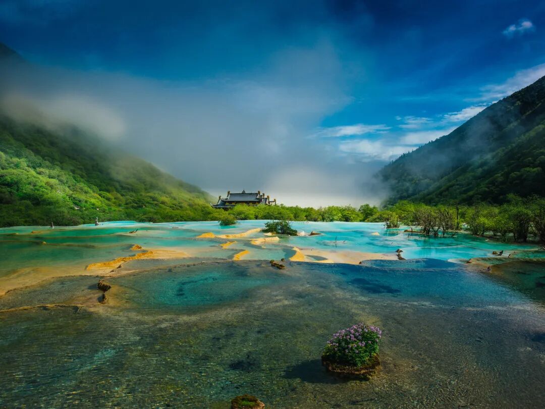 从地质层面分析,丰水期的高流量不仅让钙华池呈现出蓝绿交织的通透色彩,还持续推动碳酸钙沉积,使金沙铺地、争艳池等景观在水流冲刷下保持鲜活的纹理。此时的黄龙,是典型的“动态钙华”样本——流水、彩池、森林相互依存,每一处波光都在诉说着高原水文与地质的协同演化过程。