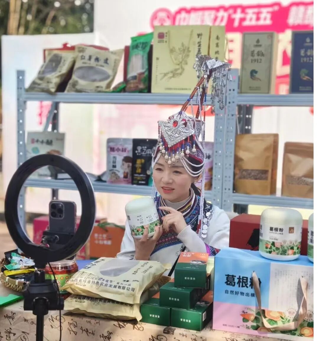 主会场外设置了“村咖+村播”实景体验区与户外展销区,让群众沉浸式体验“线下体验+线上推广”的新模式。横峰县“村播联盟”首批10名女主播开启直播矩阵,葛粉、茶叶、蜂蜜等本土农副产品在直播间依次展示,互动问答、限时秒杀等形式吸引了大量关注,助力乡土好物走出乡村、迈向更广阔的市场。农产品展销区人头攒动,女性创业者现场展示产品,与采购商、消费者面对面交流,通过“线下体验、线上下单”的方式,让好物直接送达消费者手中。
