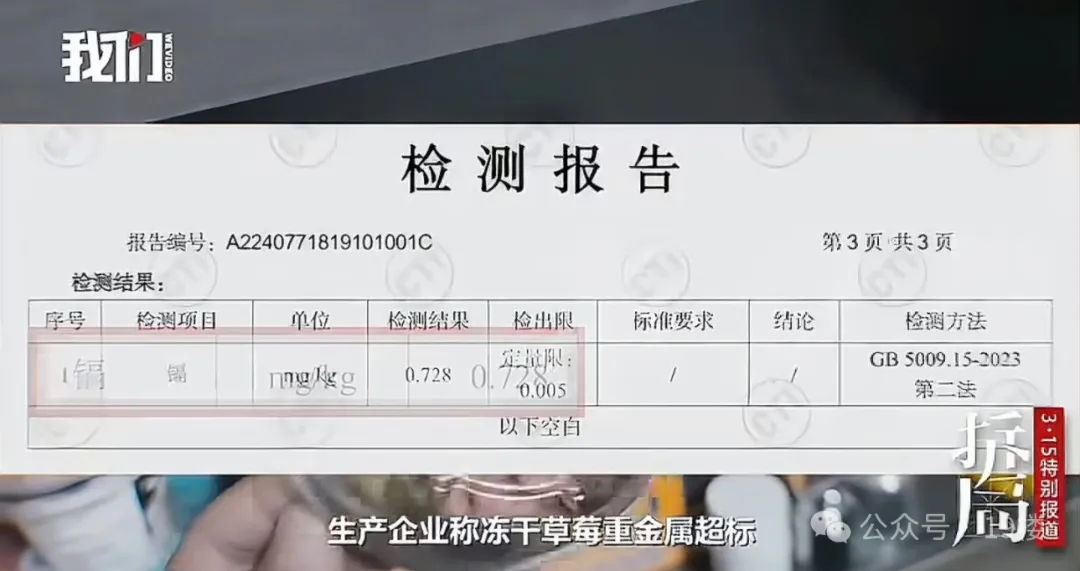 2026年1月,福建漳州泰湖谷场食品负责人林女士称,公司采购的21吨冻干草莓镉含量超标14.56倍,还检出20多种超范围农残,9批次含2019年禁用的高毒农药克百威。她确认问题源于上游原料,多次举报却因国标空白遭业内非议。