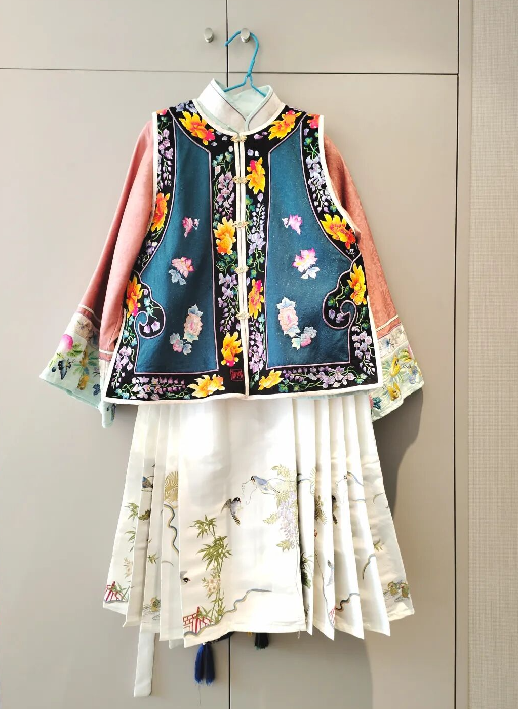 除了震撼的巨幅作品,一套纯手工苏绣传统华服同步亮相,将嘉定元素与吉祥寓意融入针脚。外衣以精湛针法绣制紫藤花与鲤鱼,对应紫气东来、远香湖鱼跃龙门的美好祈愿;内衬绣有兰蝶齐芳、福禄寿三多图案,巧妙呈现中国传统吉祥文化,华服登场便成为全场焦点,尽显东方服饰的雅致与大气。